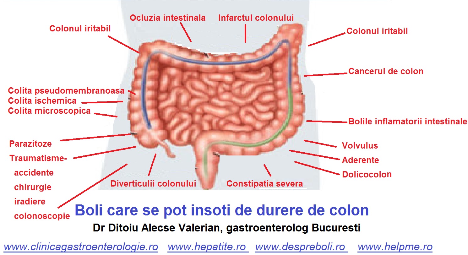 Simptomele colonului iritabil sunt banale, frecvent intalnite pe perioade scurte de timp la fiecare dintre noi. Din experienta mea insa, riscul cel mai mare este ca simptomele acestea pot fi date si de boli mult mai grave, aveti alaturat de exemplu o schema ca principalele boli care dau durere in regiunea colonului, si dupa cum vedeti sunt destul de multe.